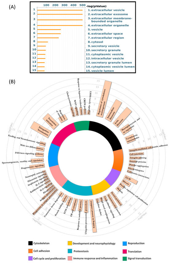 Enrichment analysis of NORMO EV protein cargo by Gene Ontology. (A) GO Cellular localization: representative scheme of the top 15 most abundant GO terms. The x-axis indicates the −log(p-Value), while the y-axis indicates different GO terms ordered by −log(p-value). (B) GO Biological Processes: visual representation of enriched GO Biological Processes (BP) terms for shotgun proteomic data of EVs isolated from human seminal fluid of NORMO subjects. Coloured bars constituting the circle graph represent the nine most enriched general BP terms. The length of the coloured bars indicates the mean of the −log(p-value) of all related specific BP terms. Salmon pink bars represent enriched specific BP terms, and the length of the bars indicate the −log(p-value) of the term. Therefore, the longer the bars, the higher the significance.