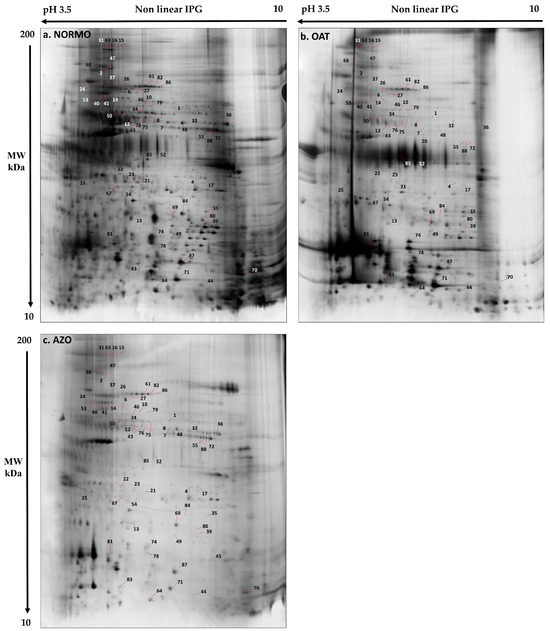 A comparative 2DE analysis of NORMO, OAT, and AZO EV samples was performed to highlight differentially expressed protein species specific for each group (Figure 4). The gel images showed an average of 1690 spots, and the comparative analysis extrapolated a total of 80 differentially abundant spots according to the ANOVA test (p < 0.05), among the three conditions, with a fold change >2.5.