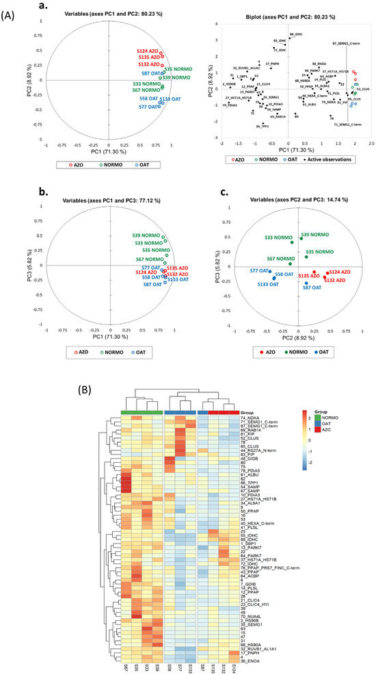 The principal component analysis (PCA) (Figure 5A) of most representative spots highlighted the clustering of OAT and AZO samples, revealing their similar protein pattern with respect to the NORMO condition. Samples were clustered close to each other, distributing the three conditions along PC2. PC1 shows a sufficient percentage of the total variability of the scatter plot. Figure 5A, panel b, shows the PCA distribution from another point of view (PC1: 72.31% and PC3: 5.44%) that highlights the peculiarity of the NORMO condition with respect to OAT and AZO, while panel c reports the distribution between PC2 (8.92%) and PC3 (5.44%). The NORMO condition remains distant from AZOO and OAT along PC2, while AZOO and OAT were mostly distinguished by PC3.