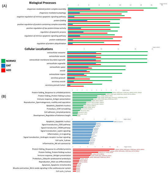 MetaCore analysis. (A) MetaCore enrichment analysis of the three groups of proteins (highly abundant in NORMO-green; highly abundant in OAT-blue; highly abundant in AZO-red). All groups reported the comparison of GO Biological Processes and Cellular Localization. (B) Individual Process network analysis by MetaCore of the highly abundant proteins in NORMO (green), OAT (blue), and AZO (red) EV samples, respectively. Process network terms were reported on the left part of the histograms, indicating the statistical significance. At the right side of the histograms were the proteins that mostly influenced that process network.