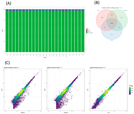 The sperm EV isolates from the same NORMO, OAT, and AZO sample cohort were in parallel analyzed for the composition of their RNA cargo. The RNA isolated from EV pellets was sufficient to yield about ~28 M raw reads per sample during the RNA sequencing run, with an average of ~26 M aligned reads per replicate, which is close enough to the 30 M specified in the experimental guidelines developed by the ENCODE consortium to define optimal bulk RNA sequencing experiments. Unfortunately, the deduplication step drastically reduced this number of reads to ~3 M. This is not unusual for a very low input RNA samples that need a high number of PCR amplification cycles at initial steps and are likely to produce a high number of PCR artefacts. Approximately 90% of deduplicated reads were attributed to human genes using GENCODE annotation on GRCh38 reference genome, obtaining ultimately an average of ~2.6 M counts per sample. The whole count matrix comprised a total of 35,056 different detected features, most of which were very lowly expressed. Most reads were associated with protein-coding transcripts (Figure 7A). After first filtering out the non-protein-coding transcripts, and then all the transcripts with low counts (lower than 10), the number of features dropped to 17,724 and 11,429, respectively. Of the latter, 10,283 were commonly detected in all sample groups (Figure 7B).