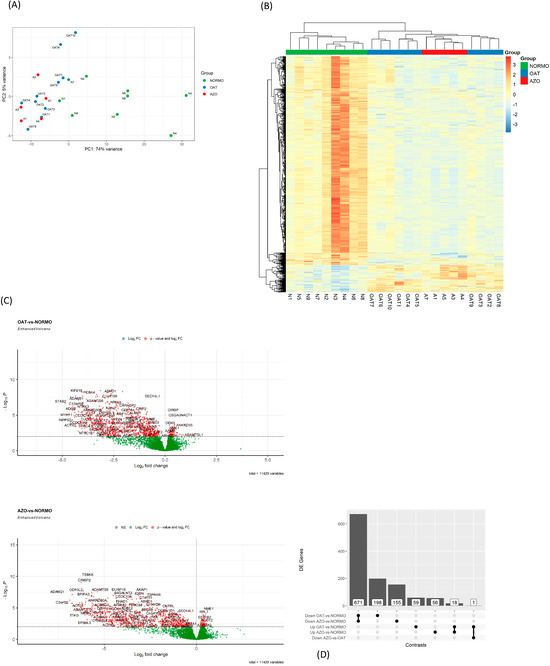 Differential gene expression between NORMO, OAT, and AZO. (A) Principal component analysis (PCA) showing distinct separation of NORMO with respect to the other two groups. (B) Heatmap with hierarchical clustering represents the expression levels from three groups: AZO (red), OAT (blue), and NORMO (green). The colour scale indicates gene expression intensity, with red representing higher expression and blue indicating lower expression. (C) The Volcano plot contrasting gene expression between OAT and NORMO (upper panel) and AZO vs. NORMO (lower panel) groups. The log2 fold changes on the x-axis show the magnitude of expression differences, while the −log10 p-values on the y-axis indicate statistical significance. Genes that are significantly differentially expressed, surpassing set thresholds for fold change and p-value, are labelled and coloured to stand out from non-significant ones (green) The fold change threshold has been set to zero. (D) The image presents a bar chart displaying the number of differentially expressed (DE) genes between three study groups: AZO, NORMO, and OAT. The chart shows comparisons between groups, indicating the direction of expression change. The tallest bar represents many genes downregulated in OAT compared to NORMO, while the smallest bar indicates a single gene downregulated in AZO compared to OAT.