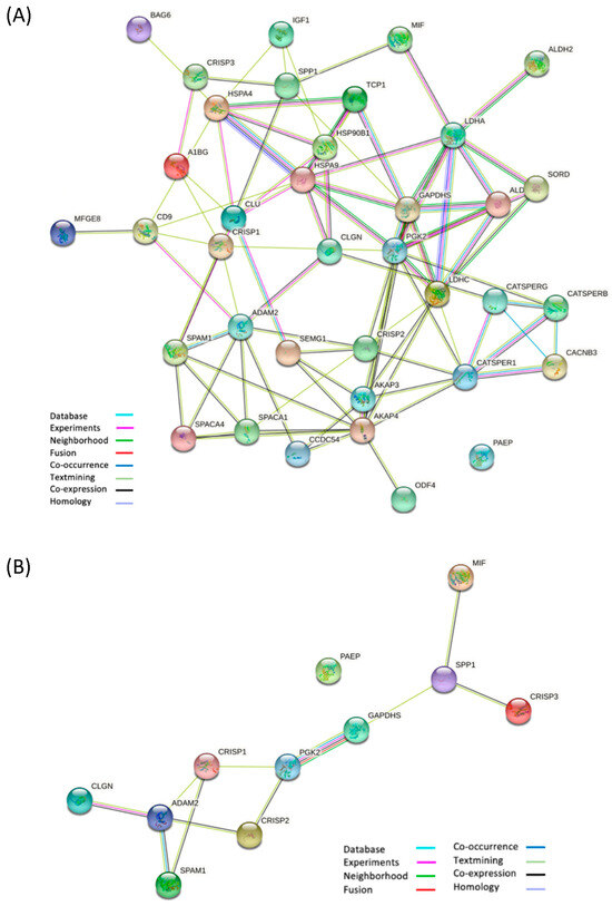 Network of interactions of proteins involved in the fertilization pathway generated by STRING. (A) A general overview. Specifically Alpha-1B-Glycoprotein (A1BG), Disintegrin and metalloproteinase domain-containing protein 2 (ADAM2), A-Kinase Anchor Protein 3, 4 (AKAP3, AKAP4), Aldehyde dehydrogenase 2 (ALDH2), Aldolase A (ALDOA), BAG cochaperone 6 (BAG6), Voltage-dependent L-type calcium channel subunit beta-3 (CACNB3), Cation channel sperm-associated protein 1, beta, gamma (CATSPER1, CATSPERB, CATSPERG), CD9 antigen (CD9), Calmegin (CLGN), Clusterin (CLU), Cysteine-rich secretory protein 1, 2, 3 (CRISP1, CRISP2, CRISP3), Glyceraldehyde-3-phosphate dehydrogenase, testis-specific (GAPDHS), Heat shock protein family A member 4 (HSPA4), Endoplasmin (HSP90B1), Stress-70 protein, mitochondrial (HSPA9), Insulin-like growth factor 1 (IGF1), Lactate dehydrogenase A, C (LDHA, LDHC), Lactadherin (MFGE8), Macrophage migration inhibitory factor (MIF), Outer dense fibre protein 4 (ODF4), Glycodelin (PAEP), Phosphoglycerate kinase 2 (PGK2), Sperm acrosome membrane-associated protein 1, 4 (SPACA1, SPACA4), Semenogelin 1 (SEMG1), Sorbitol dehydrogenase (SORD), Coiled-coil domain containing 54 (CCDC54), Sperm Adhesion Molecule 1 (SPAM1), Osteopontin (SPP1), and complex protein 1 subunit alpha (TCP1) are shown. (B) Network of selected and investigated interactions of ADAM2, CLGN, CRISP1, CRISP2, CRISP3, MIF, GAPDHS, PGK2, SPAM1, SPP1, and PAEP proteins generated by STRING. Each node represents a protein, while edges delineate the type of interconnection (network caption).