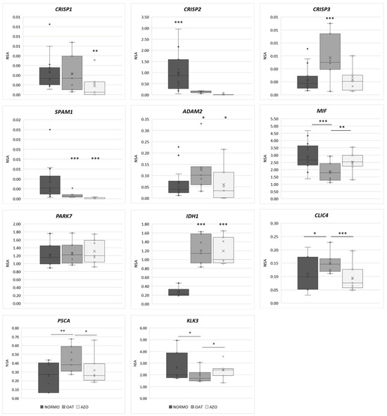 Gene expression analysis by ddPCR. Relative expression of Cysteine Rich Secretory Protein 1-2-3 (CRISP1-2-3), Sperm Adhesion Molecule 1 (SPAM1), ADAM Metallopeptidase Domain 2 (ADAM2), Macrophage Migration Inhibitory Factor (MIF), Parkinsonism-associated deglycase (PARK7), Ocitrate dehydrogenase (NADP(+)) 1, cytosolic (IDH1), Chloride intracellular channel 4 (CLIC4), Prostate stem cell antigen (PSCA), and Kallikrein-related peptidase 3 (KLK3) in seminal EVs of normozoospermic subjects. Normalization of target genes was performed using GAPDH and RNY4 as reference genes. Gene expression was performed by ddPCR. Graphical diagrams are plotted as box-whisker plots, where boxes show the interquartile range with median and mean values, and whiskers represent min and max confidence intervals. Outliers, plotted as individual dots, represent out-of-range values. * p < 0.05; ** p < 0.01; *** p < 0.001.