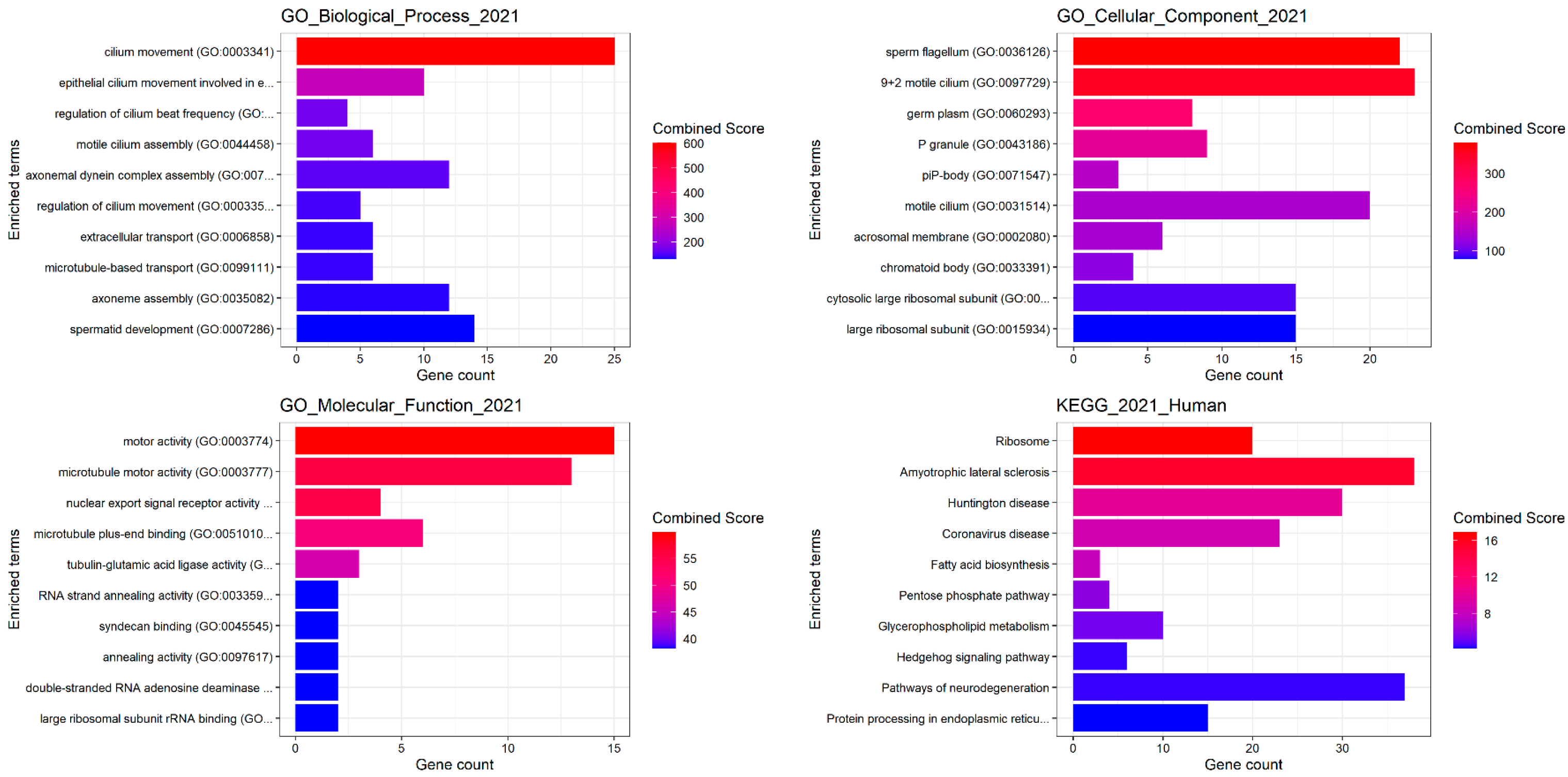Gene enrichment analysis for the biological process ontology (GO) terms. The y-axis lists the GO terms. The top 100 differentially expressed genes (DEGs) were included. The x-axis quantifies the gene count associated with each term. The bars are coloured based on a combined score, indicated by the heatmap legend on the right, with red denoting higher scores and blue representing lower scores. KEGG pathway. Chart from a KEGG pathway enrichment analysis. The enriched terms along the y-axis represent various biological pathways. The x-axis shows the gene count that correlates with each pathway.