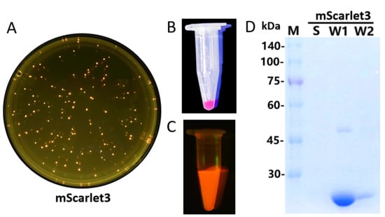 The secretion expression of mScarlet3 protein with E. coli as the host. (A) The colonies of E. coli BL21 (DE3) bearing pET23a-mScarlet3 on LB plates supplemented with ampicillin; (B) the cells of E. coli BL21 (DE3) bearing pET23a-mScarlet3 collected from shake-flask fermentation; (C) the supernatant of cells washed once with PBS. (D) SDS-PAGE analysis of mScarlet3 secreted by the recombinant strain. M denotes protein molecular weight marker (the size of each band was indicated on the left). S stands for the supernatant collected from shake-flask fermentation; W1 stands for the supernatant from cells washed with PBS once; and W2 stands for the supernatant from cells washed with PBS twice.