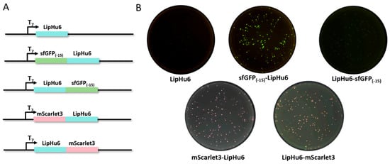 Plasmids pET28a-LipHu6, pET23a-sfGFP(-15)-LipHu6, pET23a-LipHu6-sfGFP(-15), pET23a-mScarlet3-LipHu6, and pET23a-LipHu6-mScarlet3 (Figure 2A) were transformed to E. coli BL21 (DE3). After approximately 16 h incubation at 37 °C, the colonies bearing pET23a-mScarlet3-LipHu6 and pET23a-LipHu6-mScarlet3 displayed obvious pink fluorescence under blue light in comparison with the negative control (colonies bearing pET28a-LipHu6) (Figure 2B). On the other hand, colonies harboring pET23a-sfGFP(-15)-LipHu6 displayed bright green fluorescence while colonies with pET23a-LipHu6-sfGFP(-15) showed no fluorescence (Figure 2B).