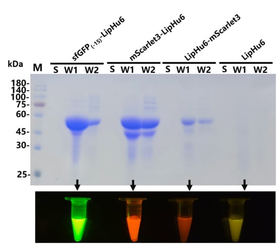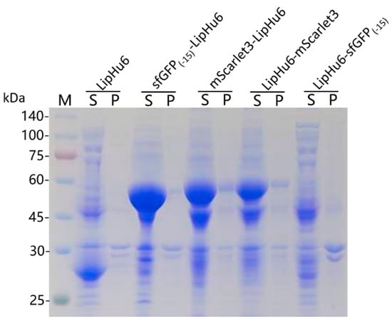 A single colony was picked from each plate for shake-flask fermentation. Consistent with the result of plate assay, SDS-PAGE indicated that a band with the predicted molecular weight of the target protein was detected with E. coli strains bearing pET28a-LipHu6, pET23a-sfGFP(-15)-LipHu6, pET23a-mScarlet3-LipHu6, pET23a-LipHu6-mScarlet3. On the contrary, no obvious band representing LipHu6-sfGFP(-15) was detected (Figure 3).