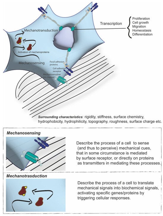 Thus, a more comprehensive framework for understanding cellular functions is needed. While the study of biochemical pathways remains essential, it is equally important to consider the mechanical effects exerted on cells [,]. These two aspects are closely interconnected. Indeed, the propagation of mechanical forces is regarded as one of the fastest signalling pathways, thus enabling the rapid conversion of physical stimuli into biochemical signals and explaining the ability of cells to adapt to their surrounding milieu rapidly [,,]. Cells experience mechanical forces either externally, such as shear stress caused by blood flow, the composition of the extracellular matrix (ECM), or the properties of neighbouring cells, or internally, as they generate forces to reshape ECM or remodel tissues during embryonic development [,,,,]. Remarkably, cells have developed the ability to sense forces provided by their external environment—called mechanosensing—through proteins and receptors that detect these mechanical inputs and convert them into signalling events, triggering specific biological responses. This process is known as mechanotransduction (Figure 1) [,,,,]. In more detail, cells integrate mechanical and chemical signals into biological responses, thereby regulating gene expression through transcriptional and epigenetic mechanisms [,,]. In response to these cues, cells generate contractile forces via cytoskeletal networks (i.e., microtubules, F-actin, and intermediate filaments) associated with actin-linking proteins (i.e., myosin II, cofilin, and filamin), creating internal tension [,]. Importantly, cells sense surrounding characteristics (Figure 1), such as stiffness, roughness, surface chemistry, and topographical cues (e.g., curvature, roughness/smoothness, micro/nanopatterns, and hydrophilicity/hydrophobicity) that allow directing downstream signalling and gene expression programs that control cell differentiation, migration, and function [,,].
