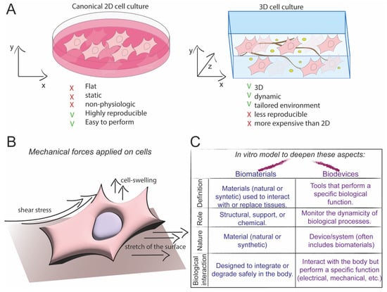 Schematic representation of different mechanical properties applied to cells. (A) Differences between classical 2D cell culture and 3D cell culture. (B) Representation of mechanical forces applied to cells and subsequent models to explore them. (C) The scheme represents differences between biomaterials and biodevices.
