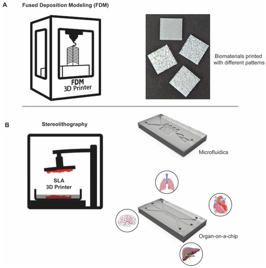 The field of mechanobiology has taken advantage of 3D printing, as it provides versatile tools to investigate both the physical forces and mechanical properties of cellular behaviour. To this aim, 3D printing enables the precise fabrication of biomimetic structures that closely replicate the mechanical and architectural properties of native tissues. Among the seven 3D-printing technologies, the two most common are fused deposition modelling (FDM) and stereolithography (SLA) [] (Figure 3). Of note, FDM is a 3D-printing method that composes objects by melting and extruding thermoplastic (or other materials) filament layer by layer. It is widely used for rapid prototyping, printing custom implants, tissue scaffolds, and medical devices using biocompatible thermoplastics like polylactic acid (PLA), polycaprolactone (PCL), and polyetheretherketone (PEEK) [,,,] (Figure 3A). SLA is a 3D-printing process that uses a UV laser to cure liquid resin into high-detail solid layers. It is commonly used for creating precise prototypes, high-precision anatomical models, custom dental and surgical guides, and microfluidic devices [,] (Figure 3B).
