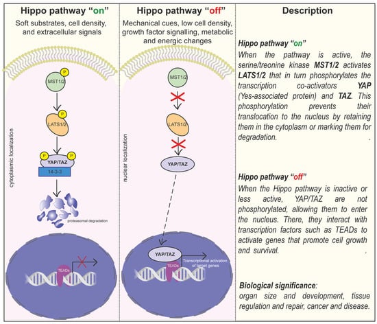 Overview of Hippo pathway and YAP/TAZ mechanotransduction. When the Hippo pathway is activated, the mammalian STE20-like protein kinases 1/2 (MST1/2) phosphorylate and activate large tumour suppressor kinases 1/2 (LATS1/2). LATS1/2, in turn, phosphorylates YAP/TAZ, inhibiting their role by “blocking” them in the cytoplasm and, consequently, degradation. When the Hippo pathway is deactivated, unphosphorylated YAP/TAZ translocates to the nucleus, whereby they promote the transcriptional activity of the transcription factors TEAD1/2/3/4 to regulate the transcription of genes associated with the cell-fate decision, such as cell proliferation, survival, and differentiation. Moreover, this pathway is known to be strictly regulated by various stimuli; for example, high ECM stiffness promotes the transcriptional activity of YAP/TAZ–TEAD.