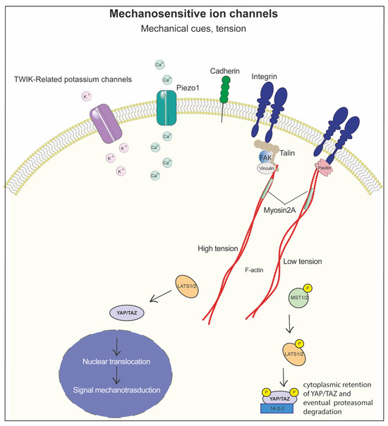 Overview of the mechanosensing pathway. The scheme represents the different membrane proteins involved in the perception of mechanical stimuli. The variation in ECM stiffness, mechanical stimuli, and extracellular signals may activate mechanosensitive ion channels such as TWIK-related potassium channels and Piezo1, and adhesion receptors such as integrin and cadherin, which in turn interact with cytoskeletal proteins (talin, vinculin, paxillin, focal adhesion kinase), linking F-actin filaments, thereby transmitting the tensions inside the cells.