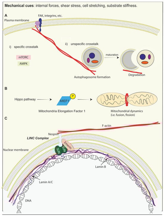 - Ravasio, A.; Morselli, E.; Bertocchi, C. Mechanoautophagy: Synergies Between Autophagy and Cell Mechanotransduction at Adhesive Complexes. Front. Cell Dev. Biol. 2022, 10, 917662. [Google Scholar] [CrossRef]