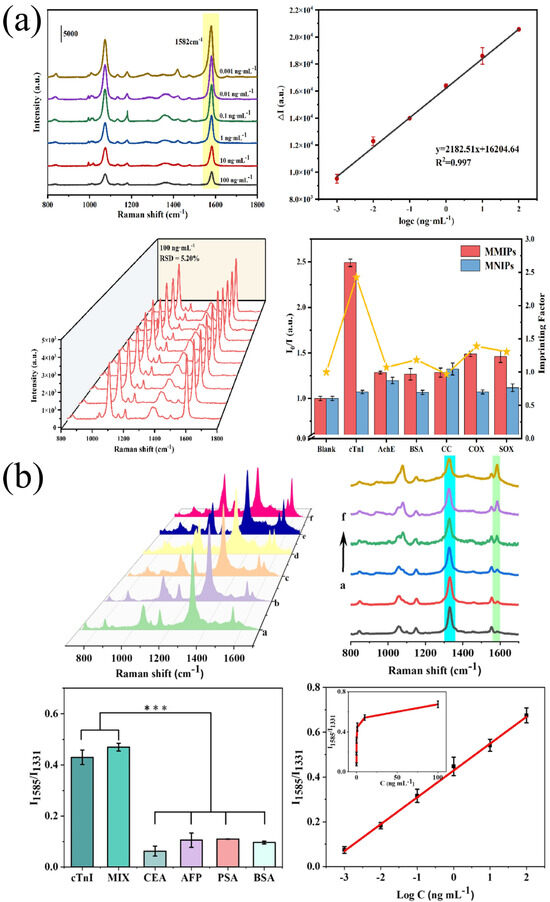 Yong Liang et al. [91] coated a ZrO2 shell layer around the Fe3O4 magnetic core using the sol–gel method. Oxygen and hydroxyl groups were used to deposit silver nanoparticles on the surface of ZrO2. In addition, the Raman probe 4-mercaptobenzoic acid (4-MBA) was introduced through the Ag-SH bond to output the Raman signal. The shielding effect of the template peptide made the Raman signal inversely proportional to the template peptide concentration. Notably, the prepared SERS magnetic molecularly imprinted material can be utilized for the rapid quantitative detection of cTnI in human serum. The SERS had a detection range of 0.001–100 ng/mL and an LOD of 0.063 pg/mL (Figure 3a). The study used clinical real serum samples (including those from healthy individuals and myocardial infarction patients) to verify performance. Spike recovery rates ranged from 103.1% to 106.3%; cross-reactivity to structural analogs (such as cTnT and myoglobin) was less than 3.5%; after 10 cycles of reuse, the signal attenuation of the material was less than 6%; and the RSD for inter-batch detection was less than 4.5%. Together these confirmed its excellent anti-interference capability, stability, and reproducibility.