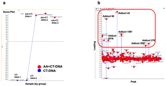 Comprehensive DNA adduct analysis. (a) Two-dimensional PCA–DA scores of DNA adducts obtained from adductome analysis. Blue: Control (CT-DNA); red: AA-treated CT-DNA. (b) Variable loading plots. Each red spot represents DNA adducts observed in DNA adductome analysis. Adducts in upper area located away from baseline are characteristic of AA-treated group, and adducts at bottom located away from baseline are characterisDNA adducts enclosed within the red-square region indicate candidate characteristic DNA adducts for AA exposuredducts for AA exposure.