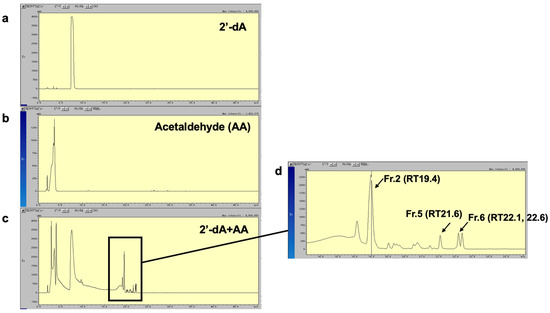 To analyze the chemical structure of the newly identified AA-dA adduct, named Adduct 42, we attempted to react 2′-dA with AA in vitro and isolate the resulting reaction product. Figure 6 shows the HPLC patterns of 2′-dA (Figure 6a) and AA (Figure 6b) and the reaction mixture of 2′-dA and AA (Figure 6c). The chromatogram patterns of the reaction mixture (Figure 6c) revealed several peaks, which were presumed to be reaction products of 2′-dA and AA. A magnified view is shown in Figure 6d, in which we isolated and purified Fr.2, Fr.5, and Fr.6, the major peaks, for further chemical structural analysis. Fr.2 and Fr.5 were identified as singlet peaks, whereas Fr.6 appeared as a doublet peak, suggesting that this substance might be a structural isomer.