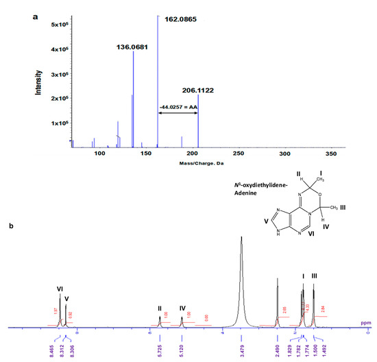 By repeating the HPLC procedure, we were able to collect approximately 1000 μg of Fr.2 for 1H-NMR spectral analysis. However, due to the low yields, we were unable to collect a sufficient amount of Fr.5 and Fr.6 for further analysis. Figure 7a shows the MS/MS fragmentation pattern of Fr.2, revealing a precursor ion peak at m/z 206.1122 and a daughter ion peak at m/z 162.0865, with a neutral loss of 44.0257, corresponding to the AA moiety. Moreover, an ion peak corresponding to adenine (m/z 136.0681) was also detected. Figure 7b presents the 1H-NMR spectrum of Fr.2 measured in DMSO-d6. From 1H-NMR spectroscopy, we observed two methyl proton signals at 1.5 ppm (3 protons) and 1.7 ppm (3 protons), as well as two methine protons at 5.1 and 5.7 ppm, respectively. The proton at 5.1 ppm was correlated with the methyl protons at 1.5 ppm in the DQF-COSY experiments, indicating their close proximity. Similarly, the methine proton at 5.7 ppm was correlated with the protons at 1.7 ppm. Protons in the aromatic region appeared at 8.3 and 8.4 ppm as singlets, corresponding to the adenine structures at the positions C8 and C2, respectively. The methyl protons at 1.7 ppm were correlated with carbon at the C2 position, as determined via HMBC proton–carbon correlation spectroscopy (Figure S2). By combining the NMR carbon–proton correlation data with the MS fragmentation patterns, we determined the compound’s chemical structure is 7,9-dimethyl-3,9-dihydro-7H-[1,3,5]oxadiazino[4,3-i]purine (N1-oxydiethylidene-adenine) (Figure 7b).