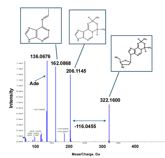 As mentioned above, Fr.6 exhibits a doublet peak, and its MS/MS fragmentation patterns are nearly identical, indicating that it is a structural isomer (Figure S3). As the precursor and daughter ion peaks at m/z 366.17 and 322.15 corresponded to a neutral loss of 44.026, which is associated with the AA moiety, the chemical structure of Fr.6 must contain at least one AA moiety. Additionally, a fragment ion peak at m/z 250.13, corresponding to the loss of a dR moiety (−116.04) from the precursor ion peak (m/z 366.17), was observed. Another loss of a dR moiety (−116.04) from the daughter ion peak (m/z 322.15) resulted in a fragment ion at m/z 206.10. Based on NMR structural analysis, we identified m/z 206.10 as N1-oxydiethylidene-adenine, whereas m/z 162.07 represents its degradation product. These fragment ion peaks (m/z 206.10 and 162.07) were observed in all the fractions, including Fr.2, 5, and 6, as well as in Adduct 42 (Figure 5, Figure 7a, and Figure S3), indicating that these compounds share a partial N1-oxydiethylidene-adenine moiety. Given the neutral loss of −116.04 (corresponding to the dR moiety) observed between m/z 322.1 and 206.1, we identified the m/z 322.15 ion peak in Fr.6 and Adduct 42 as 3-(2′-deoxyribos-1′-yl)-7,9-dimethyl-3,9-dihydro-7H-[1,3,5]oxadiazino[4,3-i]purine (N1-oxydiethylidene-dA) (Figure 8). Furthermore, because a neutral loss of −44.026 (corresponding to the AA moiety) was observed between m/z 366.17 and 322.15, the ion peak at m/z 366.17 in Fr.6 was presumed to be an exocyclic-dA adduct containing three AA moieties.