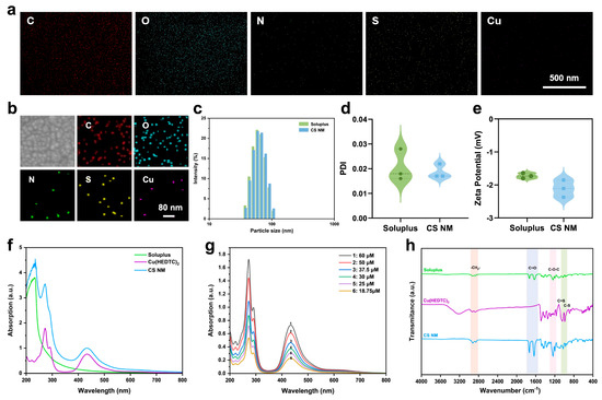 Spectral and physicochemical characterization of CS NM. (a,b) Representative elemental mapping (C, O, N, S, Cu) and scanning electron microscopy (SEM) images of CS NM verifying successful encapsulation of Cu(HEDTC)2 (scale bars: 500 nm, 80 nm; Cu(HEDTC)2 formula: C10H20CuN2O4S4). (c–e) Hydrodynamic size distribution, PDI, and zeta potential of Soluplus nanomicelles and CS NM (in ultrapure water) (n = 3). (f) UV–Vis spectra of Soluplus nanomicelles, Cu(HEDTC)2, and CS NM confirming Cu(HEDTC)2 encapsulation in CS NM through characteristic absorption peaks. (g) Concentration-dependent UV–Vis spectra of Cu(HEDTC)2 used for establishing the standard calibration curve of Cu(HEDTC)2 (n = 3). (h) Fourier transform infrared (FTIR) spectra of Soluplus nanomicelles, Cu(HEDTC)2, and CS NM demonstrating successful fabrication of CS NM. Data are presented as mean ± SD.