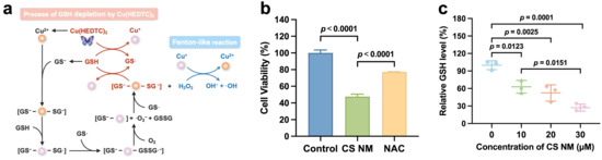 Subsequently, to demonstrate the GSH scavenging ability of CS NM, GSH level assay kit was used to detect the change in GSH content in B16 cells treated with varying concentrations of CS NM. Quantitative analysis revealed a significant decrease in intracellular GSH level in CS NM-treated groups compared to the control group, with a dose-dependent decline observed (Figure 5c). Specifically, treatment with CS NM at a concentration of 10 μM led to a notable reduction in GSH content, and when the concentration was increased to 30 μM, intracellular GSH level dropped to approximately 27% of that in untreated cells. It was worth noting that although CS NM consumption led to a depletion of copper ions during GSH scavenging, overall intracellular copper content was found to increase based on cellular copper uptake results (Figure 3a). These findings collectively indicated that CS NM exhibits biological activity in scavenging GSH, which might facilitate the occurrence of cuproptosis.
