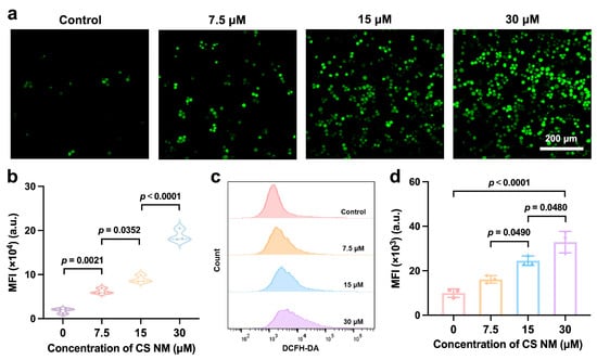 Evaluation of ROS generated by CS NM in B16 cells in vitro. (a,b) Representative confocal laser scanning microscopy (CLSM) images and semi-quantitative analysis of B16 cells stained with DCFH-DA (green: ROS) after 4 h treatment with varying CS NM concentrations (0, 7.5, 15, and 30 μM), showing ROS elevation (scale bar: 200 μm; n = 3). Fluorescence intensity was quantified using ImageJ (v1.53) and normalized to cell count. (c,d) Flow cytometry profiles and corresponding quantitative analysis of B16 cells stained with DCFH-DA after 4 h exposure to different CS NM concentrations (0, 7.5, 15, and 30μM) (n = 3). Fluorescence intensity was quantified using ImageJ (v1.53) and normalized to cell count. Data are presented as mean ± SD. Statistical significance was determined by one-way ANOVA.
