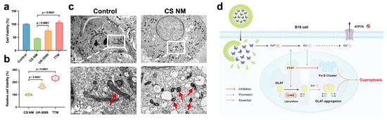 Functional validation of cuproptosis induced by CS NM in B16 cells in vitro. (a) Cell viability of B16 cells after different treatments (untreated control, 15 μM CS NM, 15 μM CS NM plus 10 μM UK-5099, and 15 μM CS NM plus 10 μM TTM), normalized to untreated controls (set as 100%) (n = 3). (b) Relative viability of B16 cells treated with 15 μM CS NM plus cuproptosis inhibitors (10 μM UK-5099, 10 μM TTM) for 24 h (n = 3). (c) Representative Bio-TEM images showing mitochondrial ultrastructural changes in B16 cells after 24 h treatment with 15 μM CS NM, including shrinkage, increased membrane density, reduced cristae (scale bars: 2 μm, 500 nm). (d) Schematic illustration of CS NM-induced cuproptosis. Data are presented as mean ± SD. Statistical significance was determined by one-way ANOVA.