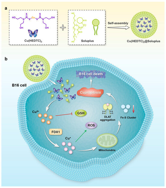 Cuproptosis, as a burgeoning form of programmed cell death, has garnered significant interest in cancer therapeutics [1]. Distinct from other well-characterized forms of programmed cell death, such as apoptosis, necrosis, pyroptosis, and ferroptosis, cuproptosis is uniquely dependent on the sustained intracellular accumulation of copper ions [2]. Mechanistically, copper directly binds to lipoylated proteins in the tricarboxylic acid (TCA) cycle, particularly dihydrolipoamide S-acetyltransferase (DLAT), triggering abnormal aggregation of mitochondrial lipoylated proteins and the depletion of iron–sulfur (Fe-S) cluster proteins [3]. These events ultimately induce proteotoxic stress and irreversible cell death [3]. As such, it has been well documented that cuproptosis-based therapy is a promising anticancer strategy. Pharmacological studies have demonstrated that excessive intracellular copper ions can induce cuproptosis, effectively eliminating various cancer cell lines, including melanoma and ovarian carcinoma [4,5].
