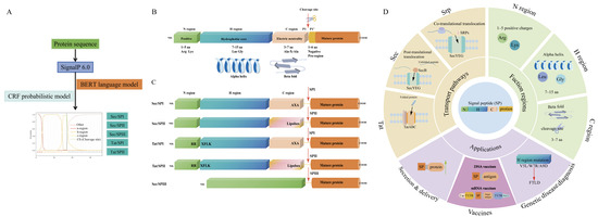A comprehensive analysis of SP prediction, structure, and application. (A) The workflow of SP prediction using SignalP 6.0. The input sequence is encoded by BERT LMs and analyzed by a CRF probabilistic model to identify the SP type and cleavage site. (B) A schematic diagram of the typical structure of the SP. The basic structure is divided into three regions, namely, the N-region (positively charged), the H-region (α-helix), and the C-region (β-fold). The region after the C-region and before the mature protein is called the pro-region. (C) The structures of different types of SPs. According to different transport pathways and the cleavage characteristics of SPase, SPs are classified into five types (Sec/SPI, Sec/SPII, Sec/SPIII, Tat/SPI, and Tat/SPII). (D) The protein translocation pathways mediated by SPs and their related application. SPs with different hydrophobicities are directed to distinct translocation pathways. SPs have multiple applications, including protein production and delivery, vaccine development, and genetic disease screening.