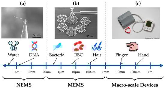 Since the birth of transistors in the 1940s, there has been an explosion of technologies leveraging the advantages of working at the micro- and nanoscale [1]. The popularization of the silicon substrates used to micromachine integrated circuits (IC’s) made room for the introduction of microelectromechanical systems (MEMS) devices [2]. Loosely speaking, MEMS devices are devices that combine electrical and mechanical components into one unified device, with characteristic sizes spanning from 1 mm to 100 nm [2]. Figure 1 illustrates some examples of features and devices at various nano-, micro-, and macroscales. These devices enable a certain task to be accomplished while also meeting miniaturization criteria including (1) the use of multiple components, (2) the ability to be mass-produced, (3) system integration, and (4) complex functions [2]. Smaller devices ranging from 100 nm to 1 nm are often referred to as nano-electromechanical systems (NEMS). Although the scale of many devices presented in this review reaches the nanoscale, these devices will be referred to as MEMS devices to simplify the discussion and match the bulk of the literature. MEMS devices are becoming essential parts of patient monitoring, treatment, and diagnosis, as medical device precision and downsizing continue to progress using different materials and manufacturing methods [3,4].