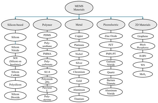 NEMS and MEMS are innovative gadgets used in a wide range of applications, such as sensors, actuators, medical devices, and communication systems. The specific categories, materials, classifications, components, and operating principles that control the functioning of these gadgets dictate the level of performance of each device [7]. Figure 2 presents an overview of common materials used in the manufacturing of MEMS devices. The unique characteristics and advantages of these materials are leveraged depending on the specific application that the MEMS device will be implemented within.