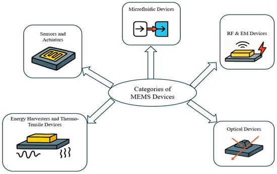 Microelectromechanical systems (MEMS) are classified based on their functional applications. Figure 4 presents key categories, such as sensors, actuators, RF components, optical systems, and microfluidics. Each type is briefly explained in the following sections, with emphasis on their relevance in fields like biomechanics and biomedical engineering.