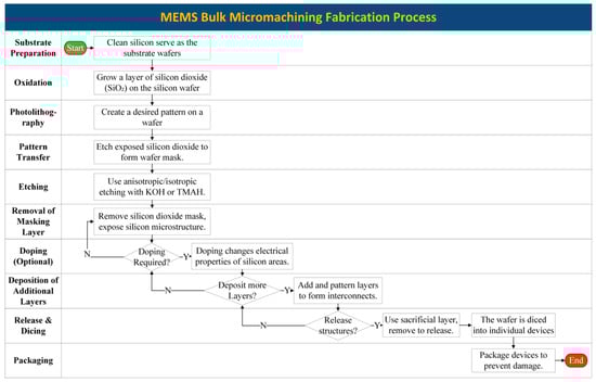 Bulk micromachining is a fabrication process that involves etching within a substrate, usually silicon because of its crystalline characteristics, to create structures that are useful in the production of MEMS, such as microfluidic channels, cantilevers, and diaphragms. To create accurate and smooth structures inside the substrate, this method employs steps such as substrate preparation, photolithography, etching, cleaning, inspection, and packaging. The steps involved in bulk micromachining are depicted in Figure 9. The following sections discuss these steps in greater detail.