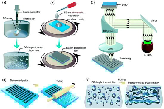 The photolithography process in microfabrication using liquid metal (a–e) (reprinted with permission from RSC) [67].