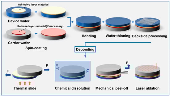 Overview of the temporary bonding and debonding process flow, where F denotes a possible external force applied to facilitate the debonding stage (reprinted from open access) [71].