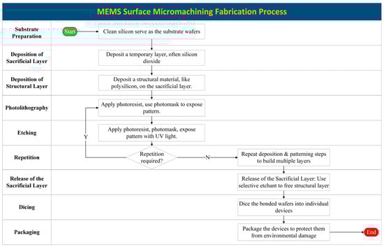 There are many similarities between bulk micromachining and surface micromachining. Surface micromachining is an MEMS production process that uses etching and thin-film deposition to create structures on a substrate’s surface. In this procedure, a sacrificial layer is deposited and patterned, and then a structural layer is added. The freestanding MEMS structure remains when the sacrificial layer is removed. Figure 12 presents the surface micromachining process. Microsensors, microactuators, and other intricate microsystems are frequently developed using this technique. Surface micromachining reduces costs by facilitating batch processing and enables the integration of layers to improve device performance. However, issues like residual stress and the requirements for exact alignment still need to be worked out. Surface micromachining is still a crucial technique for creating complex microsystems with enormous potential in a variety of high-tech industries, despite these difficulties.
