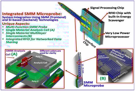 MEMS biosensors are widely used for point-of-care applications in a wide range of industries, including drug research, environmental monitoring, food safety, and healthcare [83]. For the development of integrated, scalable, and sustainable bio/chemical sensing systems used in environmental monitoring, disease diagnosis, drug discovery, and food quality assessments, MEMS biosensors are essential [84,85]. MEMS biosensors operate at the microscale, have high sensitivity, accuracy, and precision, and can easily be mass-manufactured, allowing for new developments in a wide range of biomedical applications. In addition to being dependable, they are lightweight, energy-efficient, and appropriate for challenging conditions. MEMS biosensors are employed in the tracking of fitness and medications, wearable technology, and medical diagnostics [86]. These biosensors can also assess toxins in the environment and food, identify diseases, and monitor either chemical or physical signals and biological systems [87]. The ability of biosensors to collect data quickly, accurately, and in real time across a variety of domains makes them indispensable. Figure 13 shows a single-material MEMS (SMM) system with multi-functional probes that can record individual neuron activity and detect extracellular neurotransmitters.