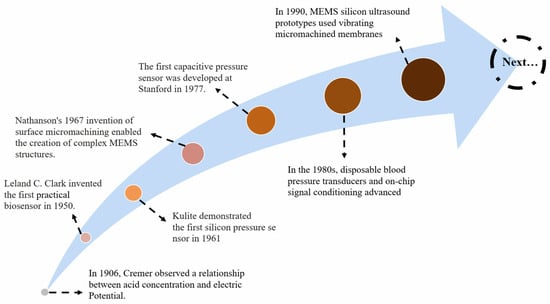 MEMS pressure sensors, particularly the capacitance and piezoresistive types, are renowned for their exceptional sensitivity and accuracy [91]. For example, a semiconductor-based MEMS pressure transmitter with a central vacuum chamber coated in an oxide with a silicon base and a thin silicon membrane was created and its ability to precisely measure blood pressure was examined [92]. These devices were shown to be able to assess blood flow in the wrist’s radial arteries, which reveals concentration shifts and membrane displacements that are used to determine an adult’s heart rate [93]. A commercial interface micromachined piezoresistive pressure device that uses a polysilicon method can also measure arterial blood pressure with an accuracy of more than 2 mmHg and is used in balloon angioplasty [94]. Meena also emphasized the development, uses, and significance of pressure sensing in the diagnosis and treatment of biological disorders [95].