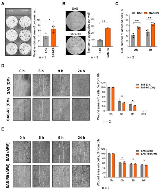 SAS-R9 demonstrates exacerbated clonogenic, adhesion, and migration properties. (A) Representative images and calculated relative stained areas of colonies (consisting of at least 50 individual cells) of SAS and SAS-R9 cells. Data represented as means ± standard deviation of N = 3 independent experiments, * p ≤ 0.05 compared with SAS cells. (B) Representative images and calculated number of aggregates in cell aggregation assay (cell–cell homotypic adhesion). A total of 500,000 cells per well were allowed to form aggregates on agarose-coated 6-well plates for 48 h in CM. Data represented as means ± standard deviation of N = 2 independent experiments, ** p ≤ 0.01 compared with SAS cells. (C) Percentage of adherent cells in cell–matrix heterotypic adhesion to collagen I assay. Cells were allowed to attach to collagen-coated plates for 2 or 3 h, non-adherent cells were removed, and adherent cells were counted using hemocytometer. Results were expressed as percentage of adherent cells out of total number of cells seeded from N = 3 experiments. (D,E) SAS and SAS-R9 cell migration in wound healing assay in CM (D) and under Arg-free conditions (E). Representative phase-contrast images (magnification X40) of cell lawns immediately after scratching (0 h) and 6, 9, and 24 h post-wounding. Cell migration rate into cell-free wound was evaluated by ImageJ software and calculated as percentage of total cell-free scratch area at 0 h. * p ≤ 0.05, SAS-R9 vs. SAS cells at indicated time points, Student’s t-test. n.s.—not significant. All experiments were performed N = 2 times.