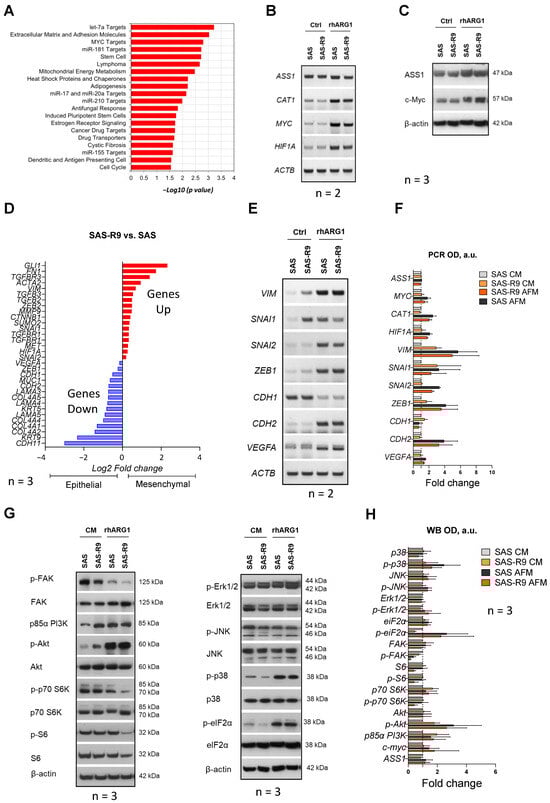 Molecular mechanisms differently regulated in SAS and SAS-R9 cells. (A) Gene sets that are most significantly deregulated in SAS-R9 (2-fold change or more) based on GO pathway analysis. The gene lists are provided in Supplementary Figure S1. SAS-R9 cells have an increased EMT phenotype compared to parental SAS cells. (B) Representative RT-PCR data sets showing the expression of ASS1, CAT1, MYC and HIF1A genes in two SAS sublines upon 24 h of 2 U/mL rhARG1 treatment (N = 2). (C) Representative Western blot data sets showing the expression of ASS1 and c-myc proteins in two SAS sublines upon 24 h of 2 U/mL rhARG1 treatment (N = 3). (D) The expression of certain EMT marker genes in SAS-R9 versus SAS cells based on mRNA-Seq analysis. (E) Representative RT-PCR data sets and densitometric OD value (F) showing the expression of various EMT specific transcription factors and biomarker genes in two SAS sublines upon 24 h of 2 U/mL rhARG1 treatment (N = 2). The ACTB gene was used as loading control. (G) Representative Western blot data sets showing the expression/activation of proteins of interest from the MAPK and PI3K-PKB/Akt-mTOR signaling pathways in two SAS sublines upon 24 h of 2 U/mL rhARG1 treatment. β-actin was used as loading control (N = 3). (H) Densitometric OD value calculated based on Western blot data from (G). of N = 3 independent experiments in ImageJ software. The original Western blot images are provided in the Supplementary Materials.
