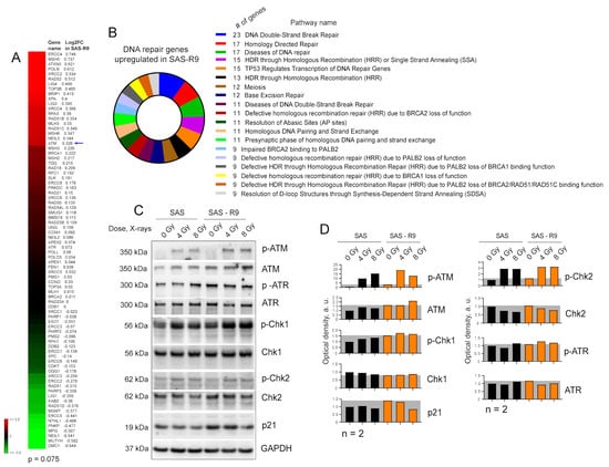 SAS-R9 cells possess the activation of the DNA repair pathways. (A) DNA repair gene set shows a strong trend towards upregulation in SAS-R9 (Wilcoxon signed rank test p-value = 0.075). (B) Reactome pathway analysis [] of DNA repair genes upregulated in SAS-R9 cells. (C) Western blot analysis of DNA damage signaling in SAS and SAS-R9 cells 1 h after irradiation with 4 Gy of X-ray irradiation. Sham-irradiated cells were used as a control. Representative images of one out of two experiments. (D) The relative optical density (OD) of C. The ODs of ATM, ATR, Chk1, Chk2, and p21 were normalized relatively to the housekeeping protein GAPDH. The ODs for the phosphorylated proteins p-ATM, p-ATR, p-Chk1, and p-Chk2 were normalized relatively to their non-phosphorylated forms. The original Western blot images are provided in the Supplementary Materials.