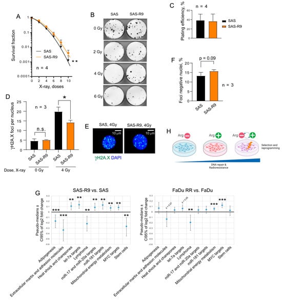 We next employed a radiobiological clonogenic survival assay to functionally validate the potential activation of DNA repair in SAS-R9 cells (Figure 5A–C). This analysis demonstrated that SAS-R9 cells have acquired relative radioresistance. Likewise, SAS-R9 cells exhibited a significantly decreased number of residual γH2A.X foci per nucleus and have a trend towards a higher number of the γH2A.X foci negative nuclei 24 h after irradiation (Figure 5D–F). These results suggest that repeated exposures and cell adaptation to ADT results in the activation of DNA DSB repair. Although SAS-R9 cells possess a high baseline in DNA damage response signaling activation (Figure 4A–D), SAS-R9 and SAS cells did not differ in the basal levels of DNA DSBs (Figure 5D), suggesting that this activation can be an adaptation to the genotoxic conditions. Indeed, the depletion of Arg might induce a severe deficiency in purine and pyrimidine nucleotides [] and replication stress []. A recent study suggests that Arg shortage leads to tumor cell tolerance to genotoxic stress []. Furthermore, a comparative analysis of the transcriptomic profiling in SAS-R9 and HNSCC FaDu RR, which were repeatedly irradiated with 12 fractions of 4 Gy of X-rays and acquired relative radioresistance [], revealed that the transcriptomic gene sets that are most significantly deregulated in SAS-R9 cells have a similar pattern of changes in FaDu RR cells (Figure 5G). All this evidence suggests that ADT-associated cell selection and reprogramming can result in tumor cell resistance to radiotherapy-induced DNA damage (Figure 5H).