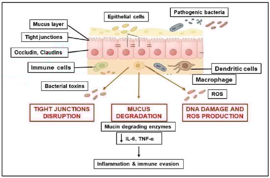 Bacterial pathogens can contribute to tumorigenesis by disrupting tight junctions, increasing intestinal permeability, and triggering inflammation. BFT produced by Bacteroides fragilis cleaves E-cadherin, disrupts tight junction proteins (such as ZO-1, occludin, and claudins), and increases epithelial permeability, facilitating tumor development [,].