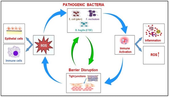 The correlation between pathogenic bacteria, ROS production, immune response, and barrier disruption in CRC; (ROS—reactive oxygen species).