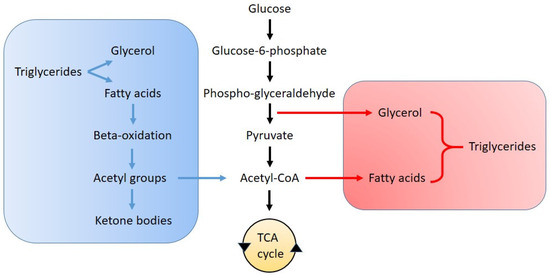 Schematic representation of the pathways of lipolysis (blue) and lipogenesis (red) in relation to glycolysis and the tricarboxylic acid (TCA) cycle.