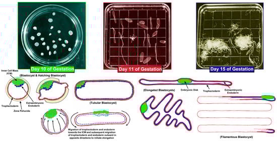 The changes in morphology of elongating pig, sheep, and cow conceptuses have been well described [6,8,9,10,15,16,17,18,19,20,21,22,23,24,25,26,27,28]. After fertilization within the oviduct, the zygote undergoes cleavage divisions which result in a mass of cells called the morula that remains encased within the zona pellucida of the ovulated egg. Embryos enter the uterus at the 4- to 8-cell stage in pigs where the morula then rapidly forms, but the morula that enters the uterus around day 6 post-fertilization in sheep and between days 4 and 6 in cows. Blastocysts form when early embryonic cells differentiate into the inner cell mass (ICM), trophoblast, and extra-embryonic endoderm with the latter surrounding a round cavity termed the blastocoel. The ICM will eventually become the embryo/fetus proper (primitive ectoderm, mesoderm, and endoderm) as well as give rise to a subjacent layer of extraembryonic cells, the trophoblast will eventually become the placental chorion, and the extraembryonic endoderm differentiates into the visceral endoderm and parietal endoderm of the yolk sac. These tissues are now collectively termed the conceptus. Conceptuses ‘hatch’ from the zona pellucida on about day 7 in pigs, days 6 to 7 in sheep, and days 9 to 10 in cows. At hatching, pig conceptuses are 0.5 to 1 mm diameter spheres that increase in size to 2 to 6 mm spheres by day 10 of gestation (Figure 1). In the day 10 blastocysts of pigs an elongation zone of densely packed endoderm and trophoblast cells extends from the ICM to the tip of the blastocyst. Then, through alterations in microfilaments and junctional complexes of trophoblast cells and formation of filopodia by endodermal cells, there is cell migration outward in opposite directions to morphologically transition to large 15 mm spheres and then to 50 mm tubes. Subsequent elongation then advances at a rate of 30 to 45 mm/h during the transition from tubular to filamentous forms, primarily by proliferation, morphological remodeling, and migration of the trophoblast and endoderm to reach the dimensions of 1 mm by 100 to 200 mm by day 11 (Figure 1). During subsequent conceptus growth there is further rapid elongation of the 100 to 200 mm long conceptus to a conceptus of 800 to 1000 mm in length by day 15 of pregnancy (Figure 1). Cow blastocysts are 2 mm spheres on day 13, elongate to 60 mm by day 16, and reach 200 mm by day 19 of gestation, whereas, sheep blastocysts are 0.14 mm spheres on day 4, 0.4 mm spheres by day 10, elongate to 33 mm filaments by day 12, and are 150 to 190 mm by day 15, extending through the uterine body into the contralateral uterine horn by days 16 to 17 of pregnancy.