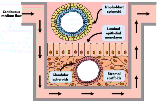 One recent advancement was the development of human endometrial “assembloids” (epithelial organoids + dense stromal cells + self-made endothelial bed) cultured in collagen-based media and with an exposed apical surface [85]. These structures were responsive to steroid hormone stimulation and presented comparable molecular signatures and architecture to the in vivo endometrium. Within 3 days of co-culture, blastoids derived from embryonic stem cells had established apposition, adhesion, and invasion into the assembloid stromal scaffold [85]. In cattle, co-culture of trophoblast spheroids and endometrial epithelial cells was proposed as a model to study the mechanisms of conceptus attachment [86]. When co-cultured with endometrial epithelial cells, the spheroids had greater expression of classical markers of cell-to-cell adhesion, such as beta 3 (β3) integrin subunit (ITGB3), as well as N-cadherin, which is also expressed in actively attaching conceptuses on day 22 of pregnancy [87]. Tinning and collaborators (2023) [67] have conceptualized a macrofluidic system that could emulate local and systemic processes that occur during pregnancy (Figure 3). This system would be nourished via continuous culture media flow. The architecture of the tissue should be sustained by stromal scaffolds containing cultured endometrial spheroids. The apical surface would be populated with an endometrial LE monolayer. Above the endometrial LR, either trophoblast blastoids or trophoblast spheroids would be cultured in appropriate media, while still exposed to products from the tissue cultured within the same well [67].