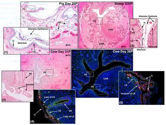 Figure 5 shows a site of conceptus implantation in the sheep from day 20 of pregnancy. What is understood about the “Adhesion Cascade for Implantation” in sheep has been reviewed in detail [6,12,13,120,137]. The electron micrographic studies of Guillomot (1981 and 1982) provide an excellent overview of the physical interactions between conceptus and endometrium during this period [19,20]. By day 14, the apical surface of elongating conceptus trophoblast cells are closely opposed to the apical surfaces of endometrial LE with the LE cells protruding into the trophoblast. At this time the conceptus is immobilized within the uterine lumen but can still be recovered intact from the uterus by lavage with only superficial damage. Between days 13 and 15, there is a reduction in the microvilli on trophoblast, but this is not observed for endometrial LE. By day 16, apposition begins near the ICM, and spreads towards the ends of the elongated conceptus with the development of cytoplasmic projections of trophoblast cells and endometrial LE microvilli that firmly adhere the conceptus to the uterus. Interdigitation of apical projections between conceptus trophoblast and endometrial LE occurs in both caruncular and intercaruncular regions of the uterus and is completed by Day 22 of pregnancy [19,20]. Between days 14 and 16, 15 to 20% of the trophoblast cells undergo consecutive nuclear divisions without cytokinesis to from binucleate trophoblast giant cells (TGCs) which express pregnancy-associated glycoproteins (PAGs) and fuse with endometrial LE to form syncytia. The extent of, and mechanistic details of the development of these syncytia continue to be investigated [57,59,154,155,156].