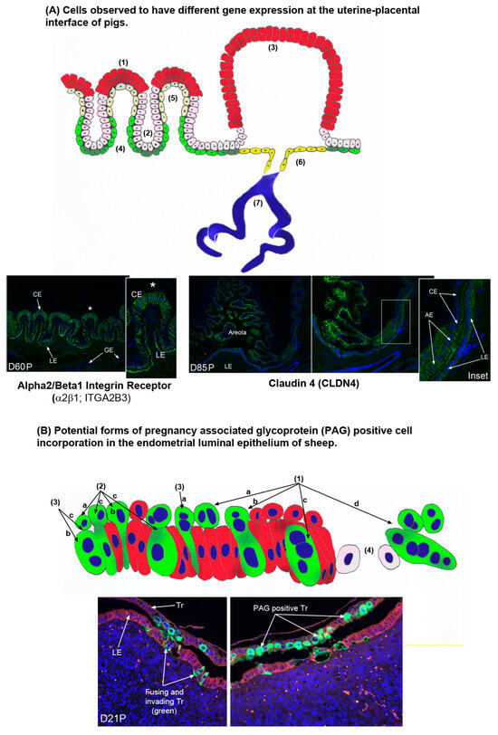 (A) There are multiple cell types at the uterine–placental interface of pigs that express genes differentially. These include the tall columnar chorion cells at the top of the uterine–placental folds indicated by the asterisks (1). Proteins expressed exclusively within these cells of the folds include solute carrier family 2A8 (SLC2A8) [39], glutaminase (GLS) [31], and brain-type creatine kinase (CKB) [123]. (2) The low cuboidal chorion cells at the bottom of the uterine–placental folds. A protein expressed exclusively within these folds cells is glutamine synthetase (GLUL) [31]. (3) The tall columnar chorion cells of the areolae. Amongst others, proteins and genes expressed in these cells, but not the chorion cells of the uterine–placental folds include cathepsin L (CTSL1) [124], SLC2A8 protein [39], mRNA for SLC2A3 [36], aquaporin 5 (AQP5) protein [123], the beta 3 (β3) integrin subunit (ITGB3) protein [125], and claudin 4 (CLDN4) protein as illustrated in the section from day 84 of pregnancy (D84P) in the figure. (4) The low cuboidal endometrial luminal epithelial (LE) cells at the bottoms of the folds of the uterine–placental interface. The integrin receptor α2β1 (ITGA2B1) protein is shown to be expressed by these cells in the section from day 60P in the figure. (5) The squamous endometrial LE cells at the tops of the folds of the uterine–placental interface. SLC2A3 mRNA is expressed exclusively within these fold cells [36]. (6) The endometrial LE cells lining the surface of areolae near the openings of the endometrial glandular epithelium (GE). OPN mRNA and protein are expressed in all endometrial LE cells except for these cells [125]. (7) Endometrial GE. Many proteins are expressed by the endometrial GE, but acid phosphate 5, tartrate resistant (ACP5, commonly referred to as uteroferrin) is only expressed in this cell type within the uterine environment of pregnant pigs where it is secreted and delivered to areolae as a component of histotroph [126,127]. (B) There may be multiple ways that pregnancy-associated glycoprotein (PAG)-positive cells are incorporated into endometrial luminal epithelium (LE) during syncytialization in sheep [9,57,59]. (1) Illustrates the formation of PAG positive binucleate trophoblast giant cells (TGCs) in the trophoblast (1a), fusion with an endometrial LE cell (1b), formation of a trinucleate syncytial cell composed of trophoblast and endometrial LE (1c), and continued fusion of TGCs with growing syncytia to form syncytial plaques at the uterine–placental interface of sheep (1d). However, PAG positive cells have been detected at the uterine–placental interface that are not predicted by these events. (2) Mononucleate PAG positive cells that are common in the trophoblast layer (2a) and sometimes appear to be invading between endometrial LE cells (2b), and mononucleate PAG positive cells are present in the endometrial LE layer allowing for the possibility that PAG positive TGCs may fuse with PAG positive endometrial LE cells, and PAG positive mononucleate Tr cells may fuse with PAG positive endometrial cells (2c). (3) PAG positive TGCs sometimes appear to be invading between endometrial LE cells and not fusing with LE cells (3a) and they are observed within the endometrial LE layer (3b), allowing for another possible means of forming PAG positive trinucleate cells, i.e., mononucleated trophoblast cells fusing with TGCs within the endometrial LE (3c). (4) Finally, fusion and invasion of PAG positive cells into the endometrial LE can lead to disruption and destabilization of the endometrial LE barrier to trophoblast contact with endometrial stroma. Bottom panels are uterine–placental interface from sheep that have been immunofluorescence stained for PAGs (green) and E-cadherin (red).