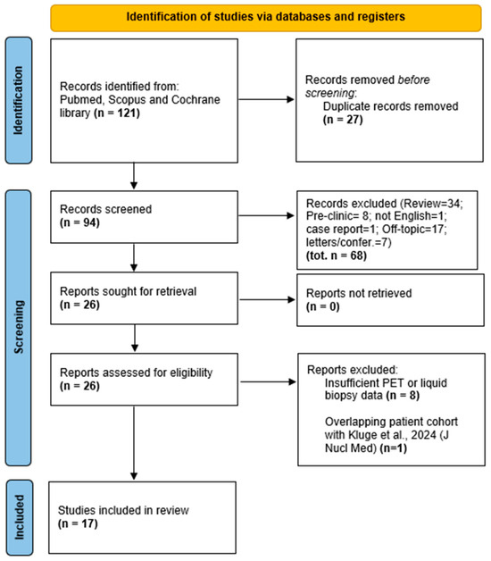 Out of 121 full-text articles retrieved, 27 duplicates were removed, leaving 94 articles for screening. Of these, 34 were review articles, 17 off-topic, 7 editorials or letters, 1 a case report, 8 preclinical studies, and 1 not in English. An additional 8 studies were excluded due to insufficient PET or liquid biopsy data. During full-text screening, we identified two studies by Kluge et al., reporting results from the same patient cohort enrolled between March 2019 and August 2021 at the Medical University of Vienna. To avoid duplicate data inclusion, we retained the article with the larger sample size (n = 148) and broader outcome analysis [9], and excluded the overlapping study [10] (n = 130). Ultimately, 17 studies met the inclusion criteria and were included in the qualitative synthesis. The study selection process adhered to PRISMA (Preferred Reporting Items for Systematic Reviews and Meta-Analyses) guidelines and is illustrated in the PRISMA flow diagram (Figure 1).